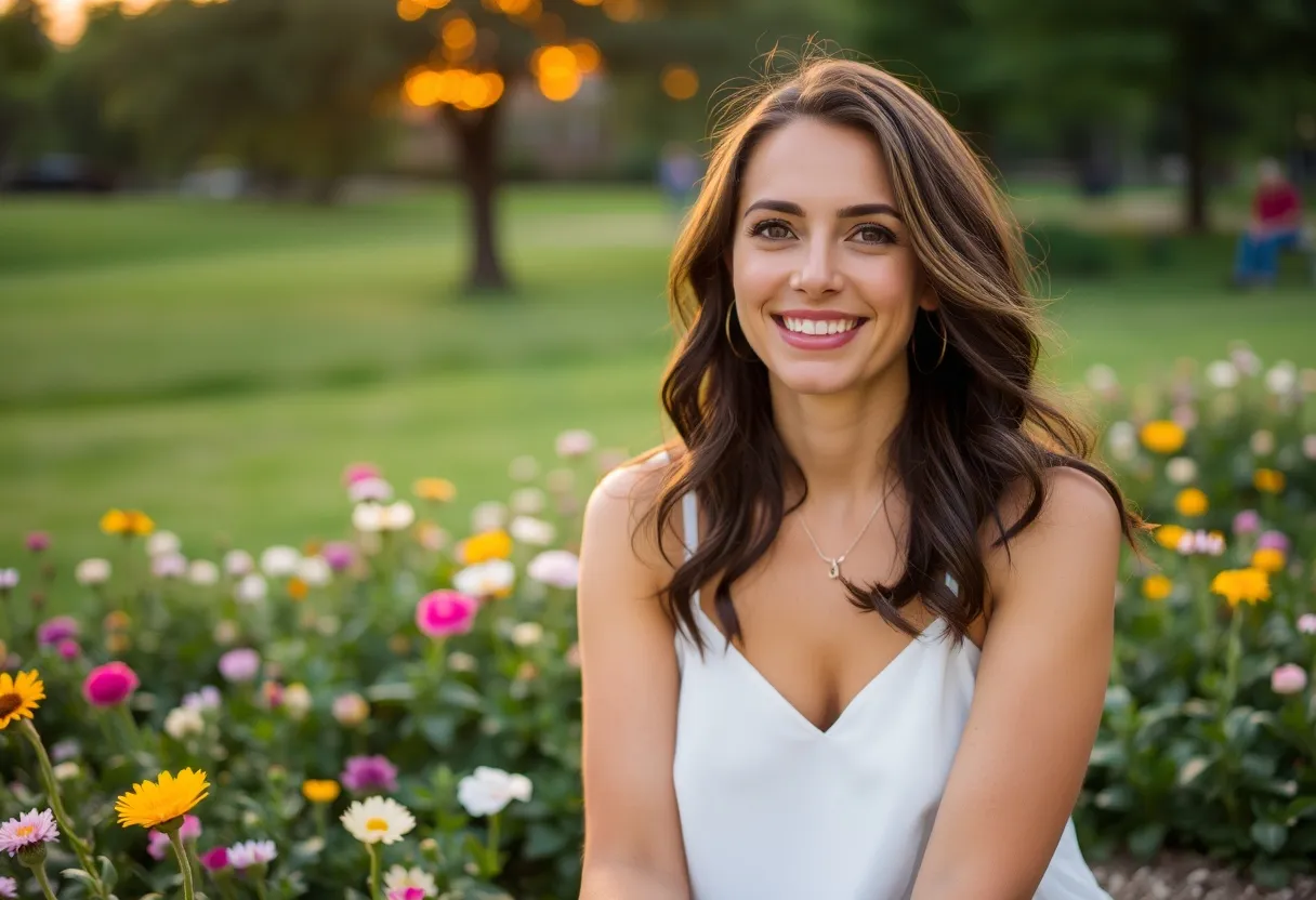 Calm, smiling woman sitting in a garden at sunset, representing nervous system balance and well-being.